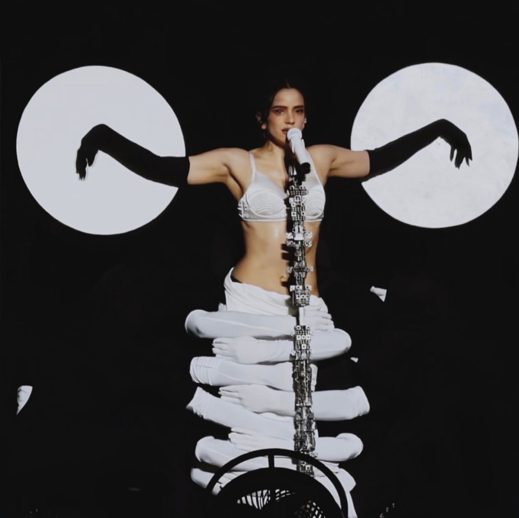 The scene unfolds in near stillness. Rosalía remains centered, her body controlled and grounded, as a series of white-gloved hands begin to emerge and multiply around her. The dancers, dressed entirely in black, disappear into the background, leaving only their hands visible—transforming the human body into a fragmented, almost impossible form. What the audience witnesses is not choreography in the traditional sense, but composition: a living, breathing sculpture shaped in real time.