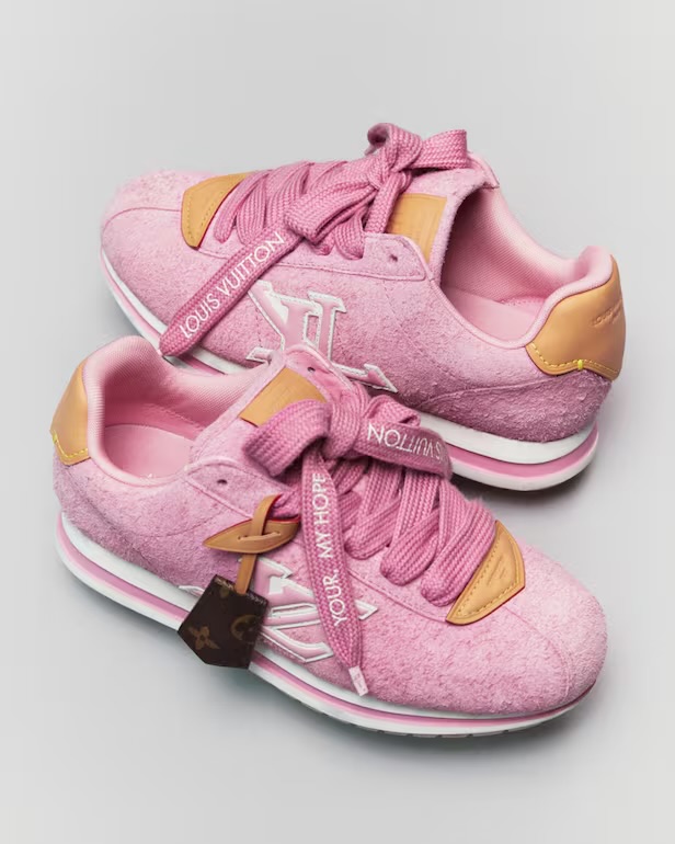 Details remain intimate: woven laces with a monogram tag, tips inscribed “Your, My Hope,” and subtle references to Louis Vuitton heritage—from trunk-inspired leather patches to a reworked label inspired by the Speedy P9 bag. A hidden squirrel-and-acorn charm adds a final, playful signature.